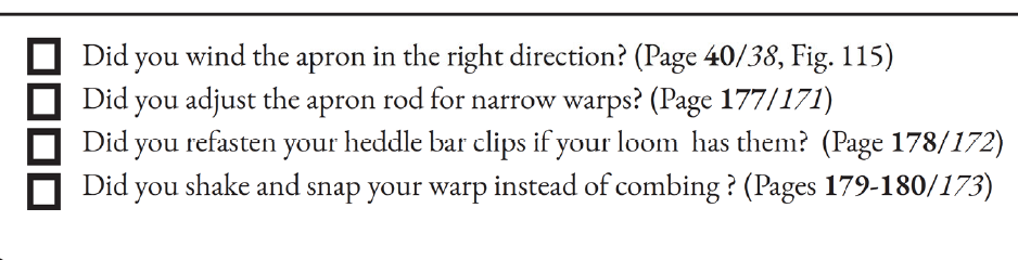 Download this handy reference guide and visual checklist for both back-to-front and front-to-back warping methods. Hang it near your loom and never again forget a step in the process of dressing your loom.
