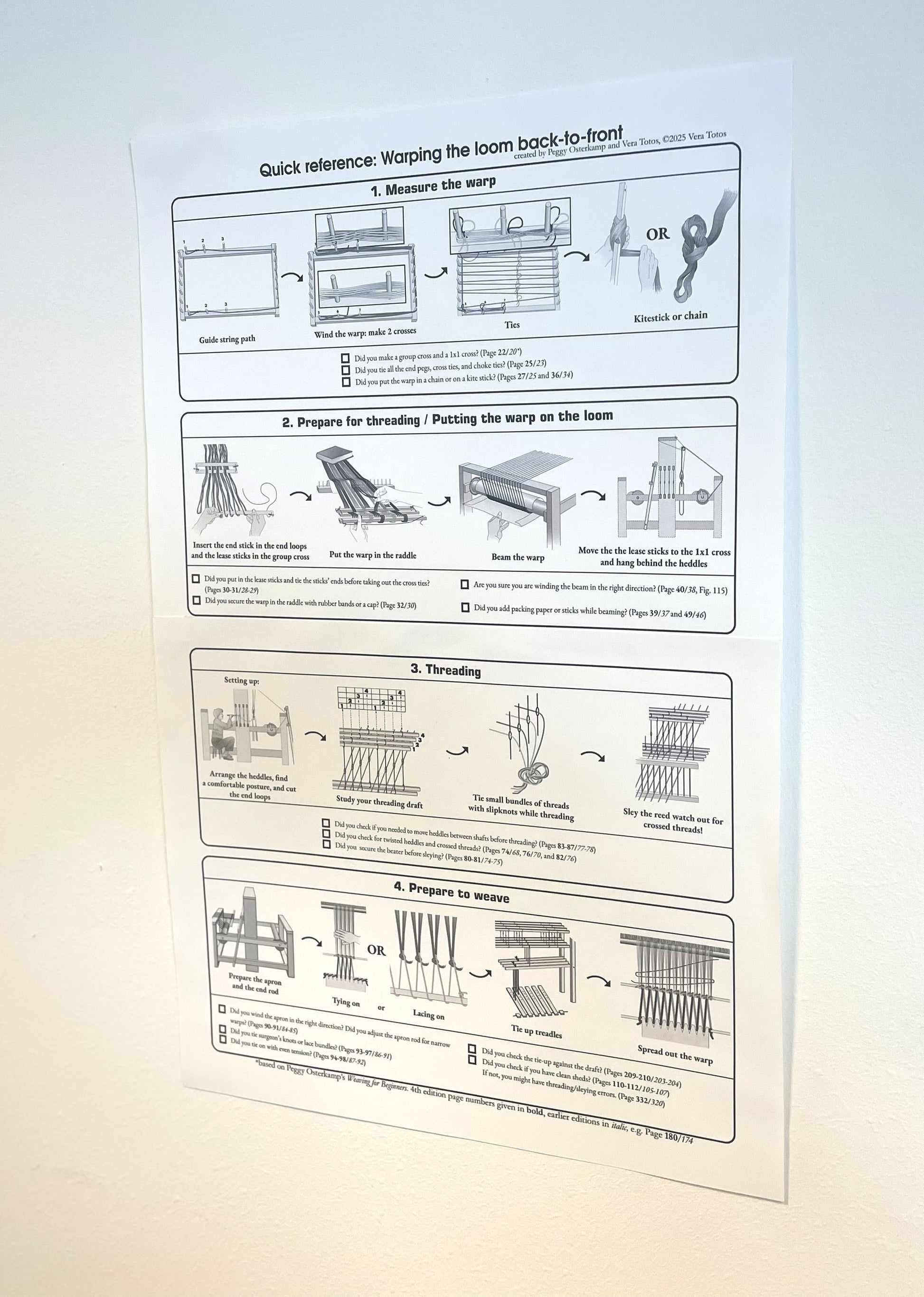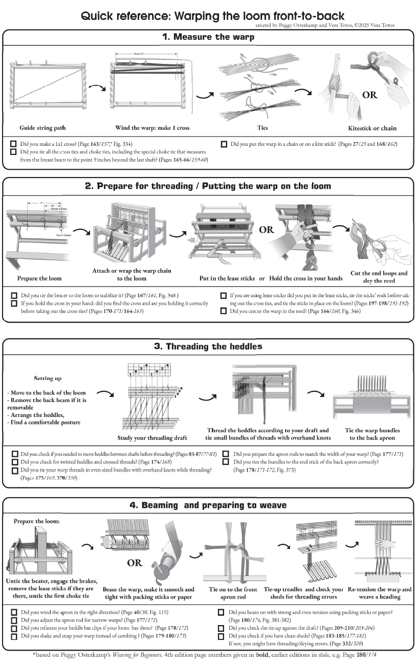 With page number references to Peggy Osterkamp's book, Weaving for Beginners. If you get stuck while warping your loom, just check the poster, and if more information is needed, crack open the book to check the right pages.